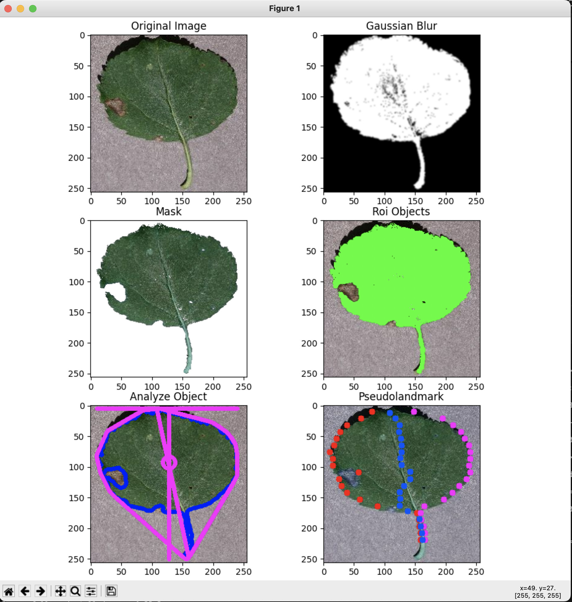 -gaussian/--gaussian_blur: 가우시안 블러-mask: 마스크 변환 (잎 영역만 추출)-roi/--roi_objects: ROI 객체 변환-analyze/--analyze_object: 객체 분석 변환-pseudo/--pseudolandmarks: 의사 랜드마크 변환-hist/--color_histogram: 컬러 히스토그램 변환