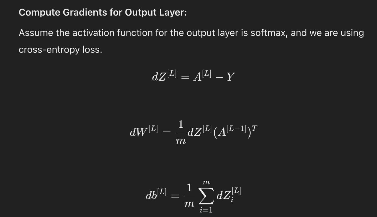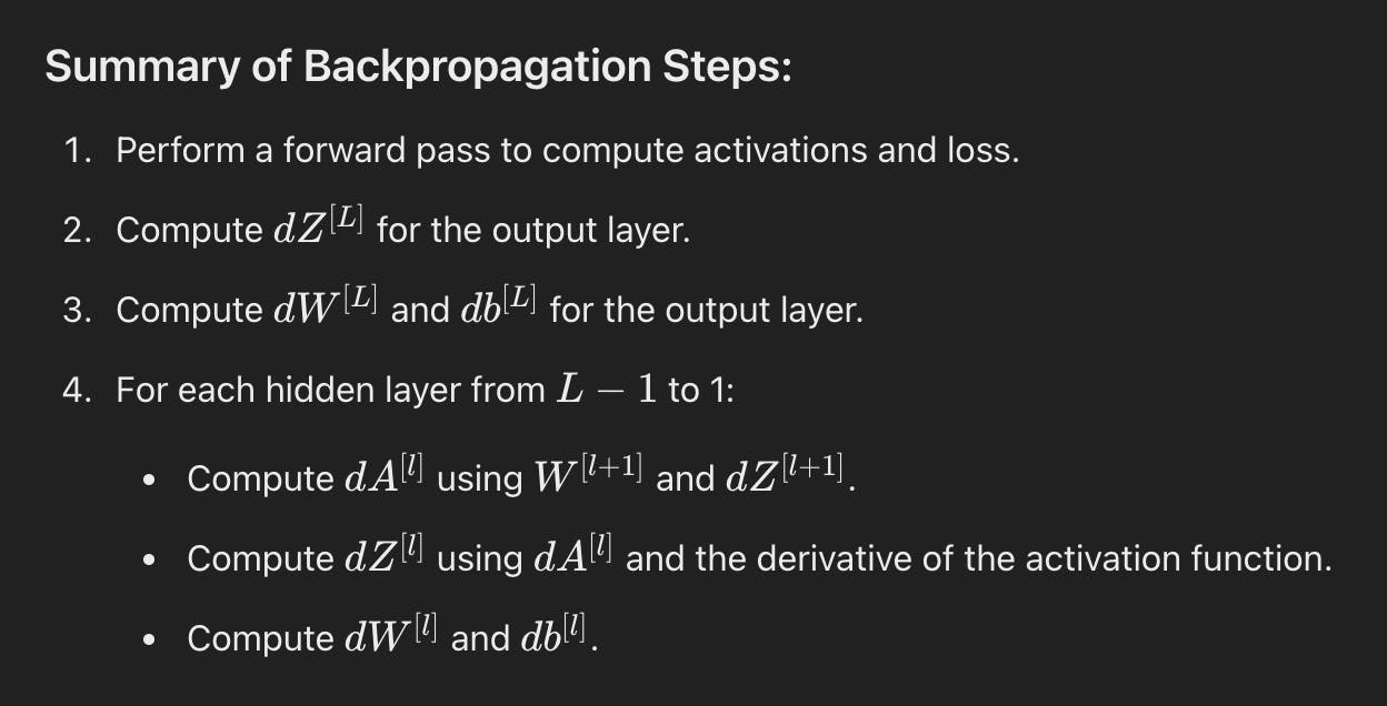 역전파 단계는 네트워크의 각 가중치에 대한 손실 함수의 기울기를 계산하는 것을 포함한다. 이는 미적분의 연쇄 법칙을 적용하여 출력층에서 입력층으로 오차를 역방향으로 전파함으로써 수행된다.